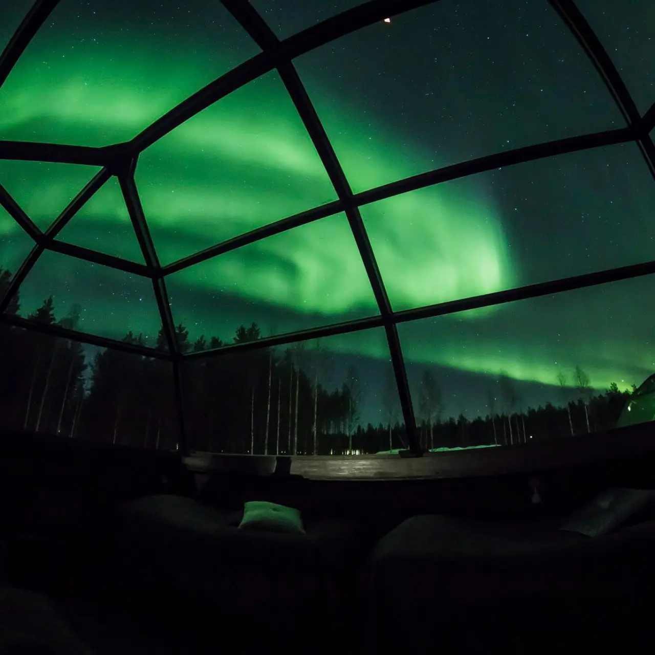Revontulet, Rovaniemi, lappi: revontulet lasi-iglun ikkunan takaaRevontulet, Rovaniemi, lappi: revontulet lasi-iglun ikkunan takaa